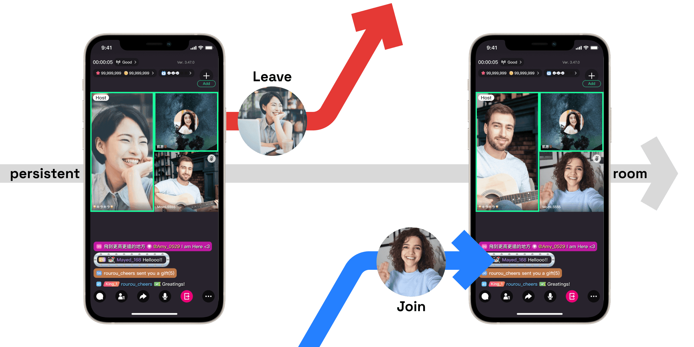 Group Call: multi-host layout system, room-state presentation, host handoff behavior, and gifting interaction logic. Group PK: waiting room loop, team-state presentation, score-visibility direction, and how new PK modules fit into one coherent interaction structure.