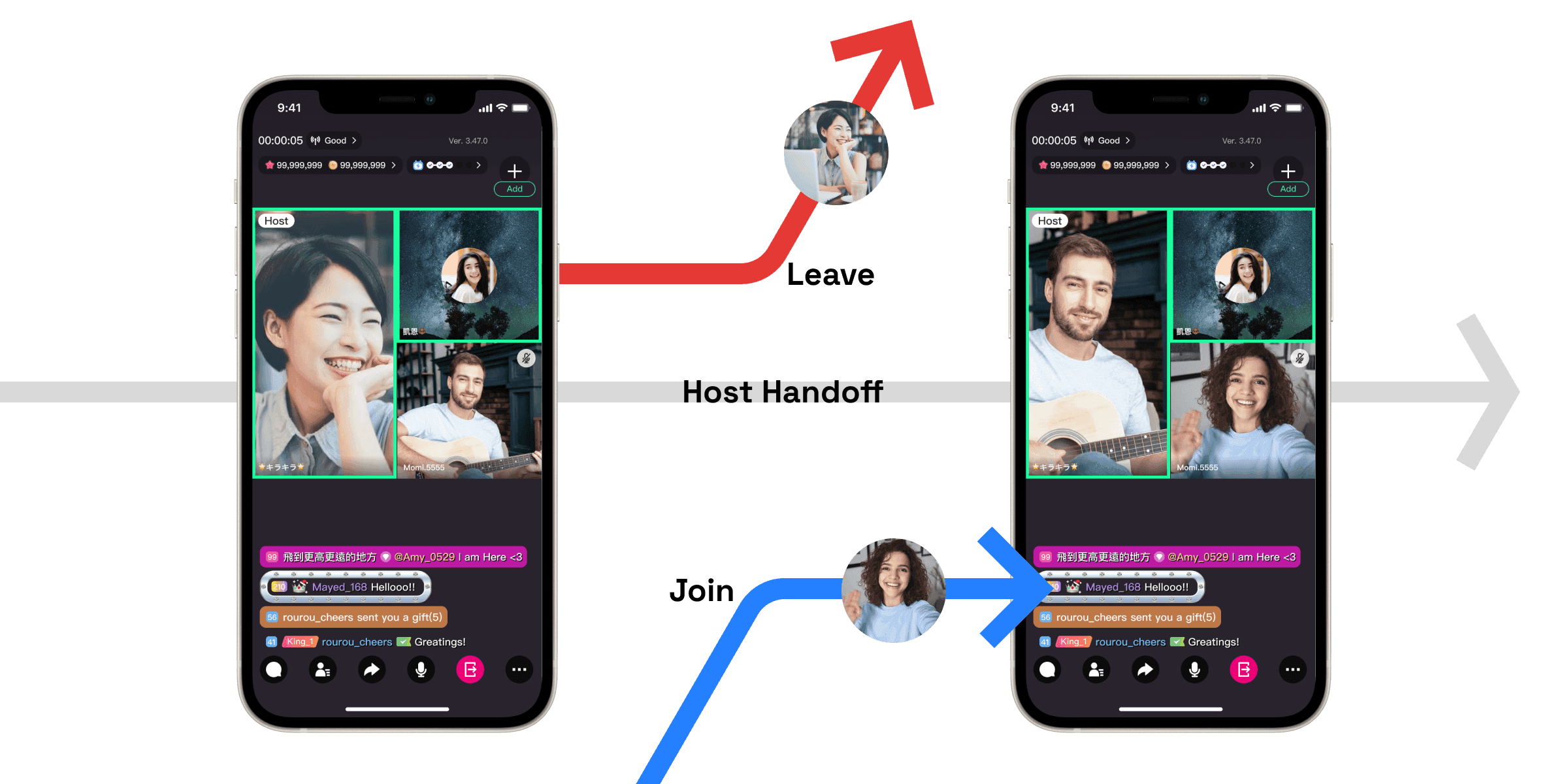 Then I treated the room itself as the product, not the original host. That is why I designed Group Call as a handoff-capable room model. Hosting responsibility could transfer, and the session could continue even after the original host left. The current host always had a default successor and could manually reassign that handoff target; once the transfer happened, the new host received a visible label and moved into the anchor position. The point was to make the change feel like a room-state update rather than a new broadcast starting. I also expanded invite logic beyond the original broadcaster so both viewers and other streamers could become the next layer of participants and keep the room alive as people joined and left.