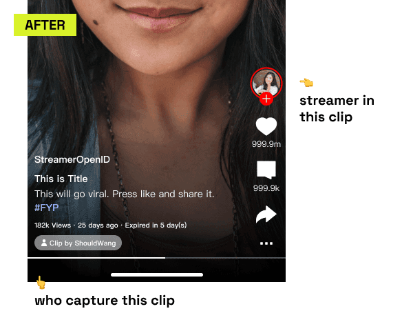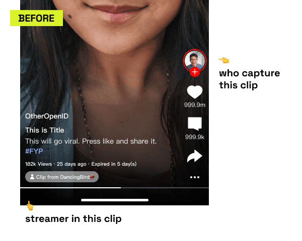 The last part was making sure clip consumption could lead somewhere. I designed the sharing flow for both external and in-app destinations, but the bigger issue was conversion. High clip consumption without visible streamer presence is just traffic that does not go anywhere. So I changed clip playback so the streamer was visible by default and the path back to their profile or live room was direct rather than buried below the video.
